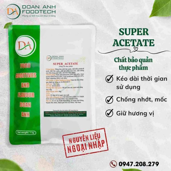 Công dụng phụ gia bảo quản giò chả SUPER ACETATE: dùng làm chất bảo quản, chất điều chỉnh độ acid, chất tạo phức kim loại, chất chống oxy hóa trong sản xuất, chế biến thực phẩm.